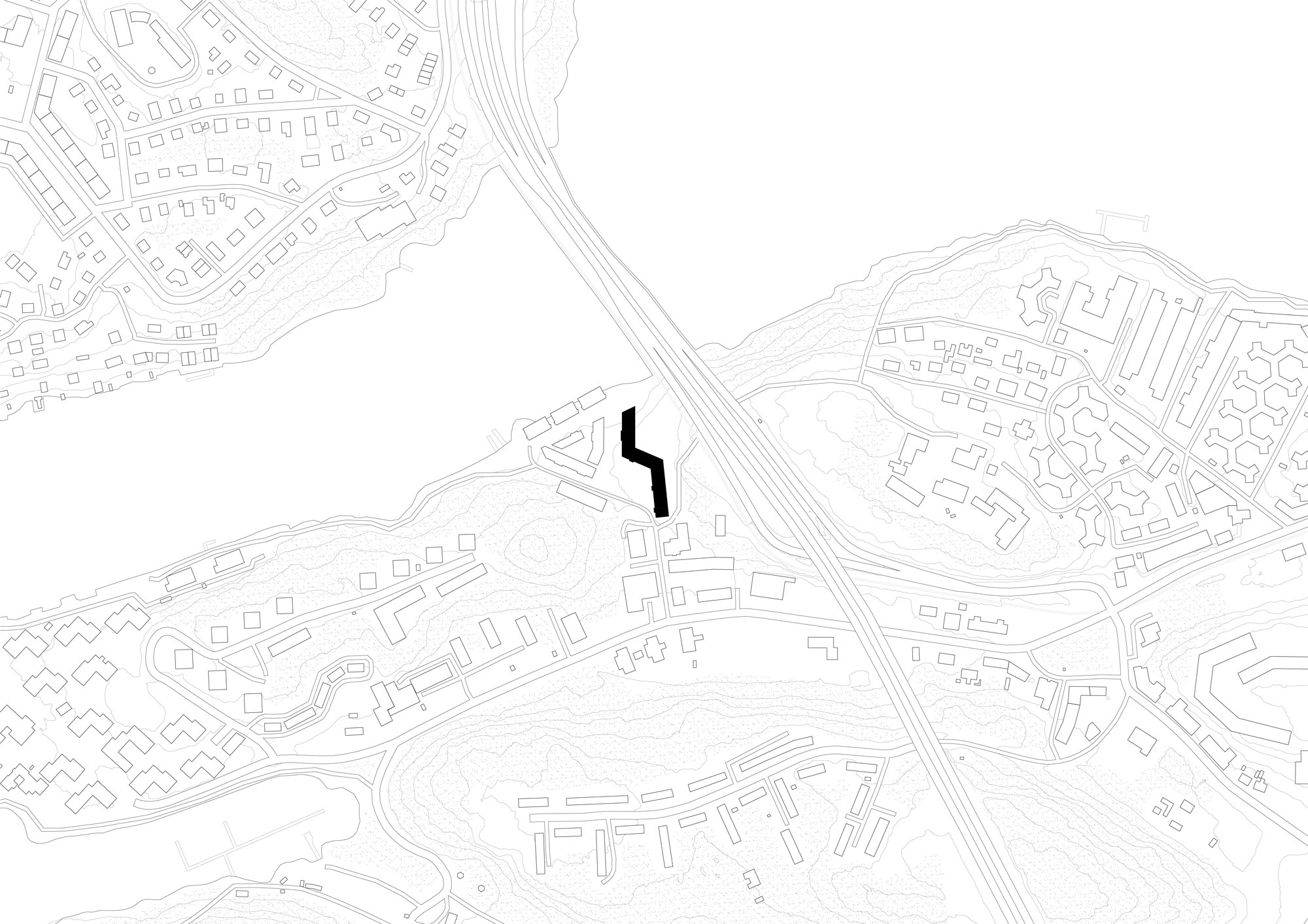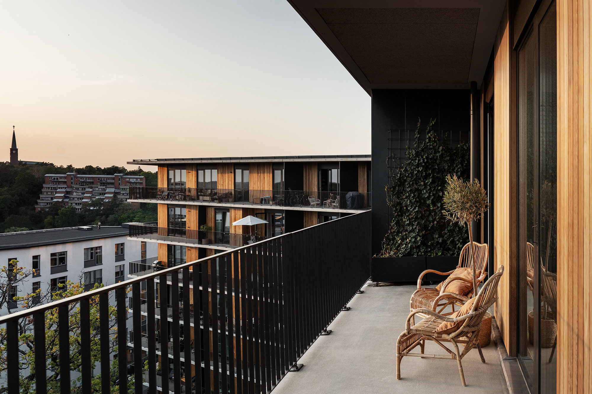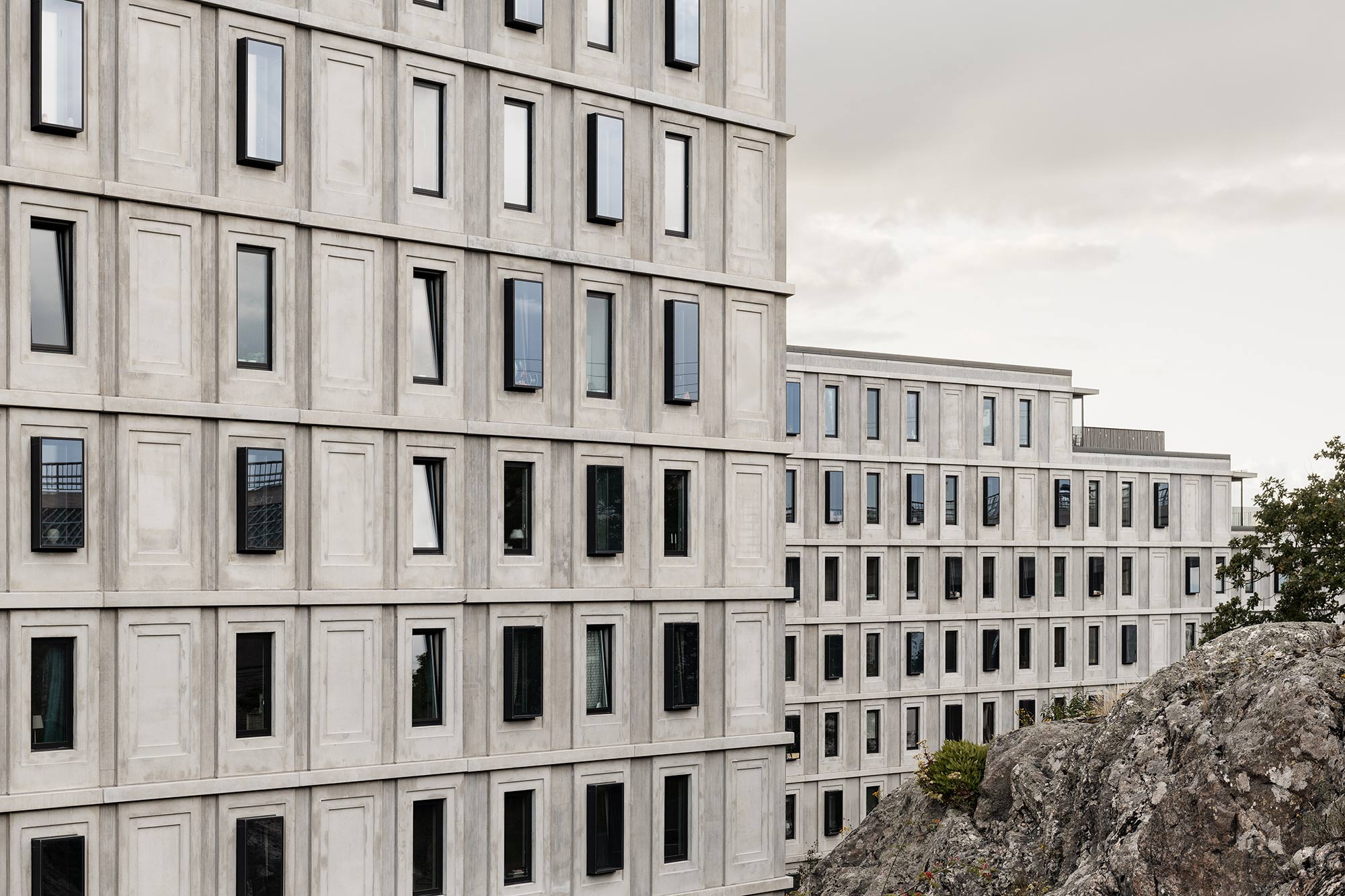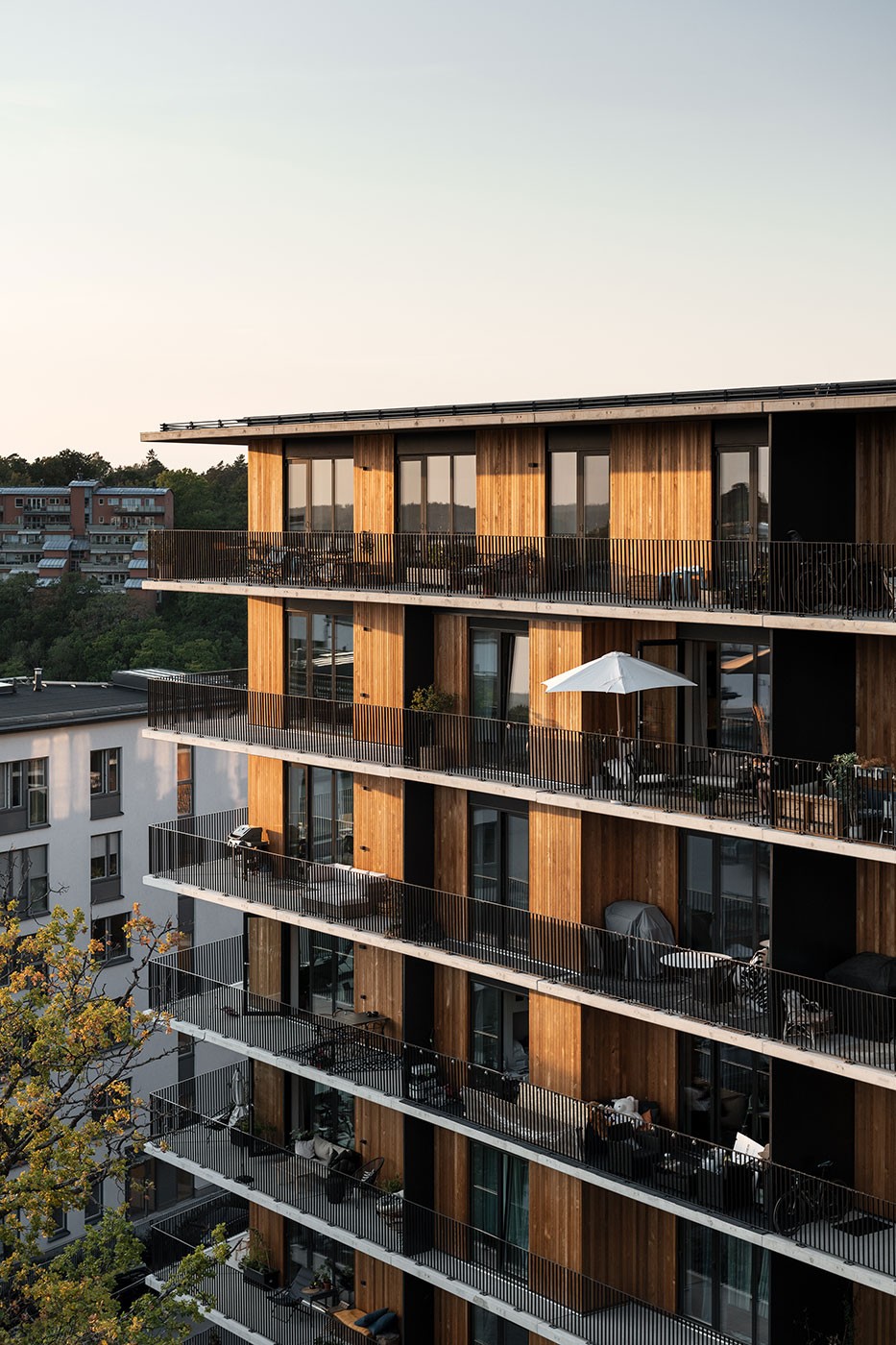 Balneum sits on a dramatic waterfront site and forms the edge to a new residential area at Gröndal Strand on the outskirts of central Stockholm. The long and crooked building contains 134 apartments and is carefully placed on the steeply sloping site to create an exciting silhouette toward the water and to reduce the perception of the building’s volume.