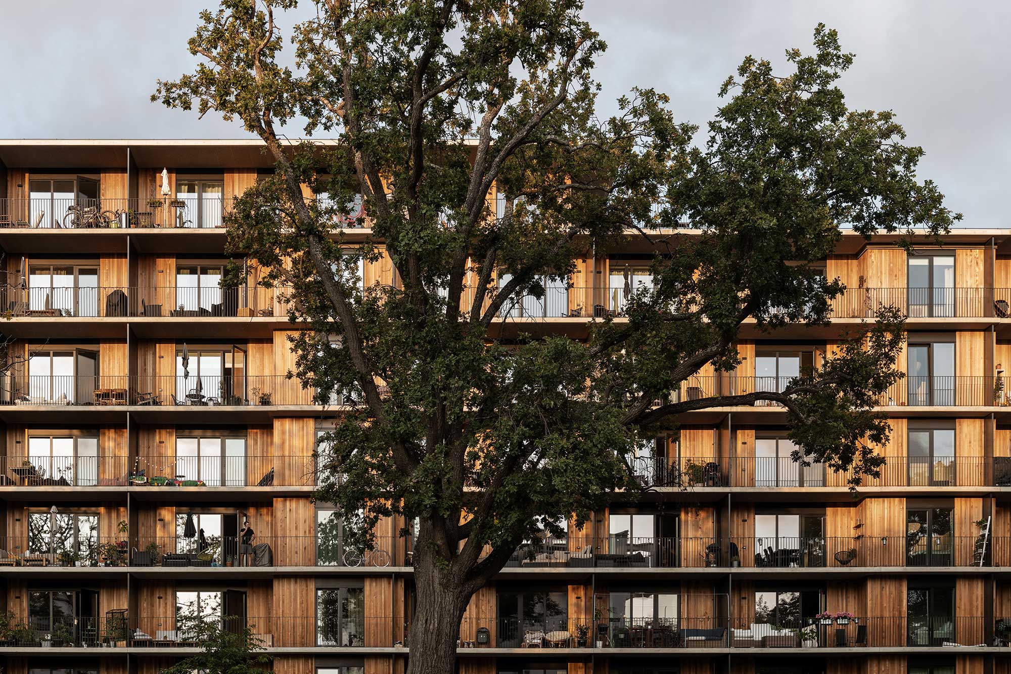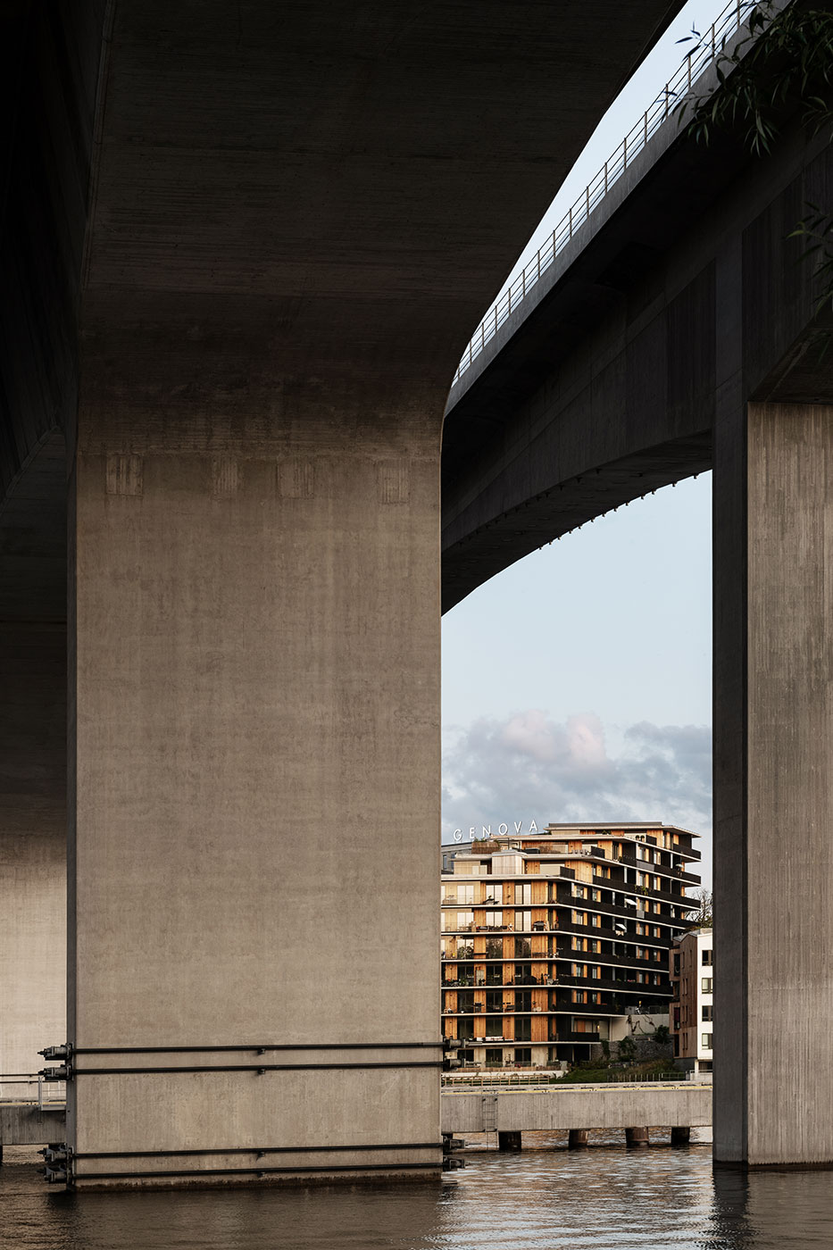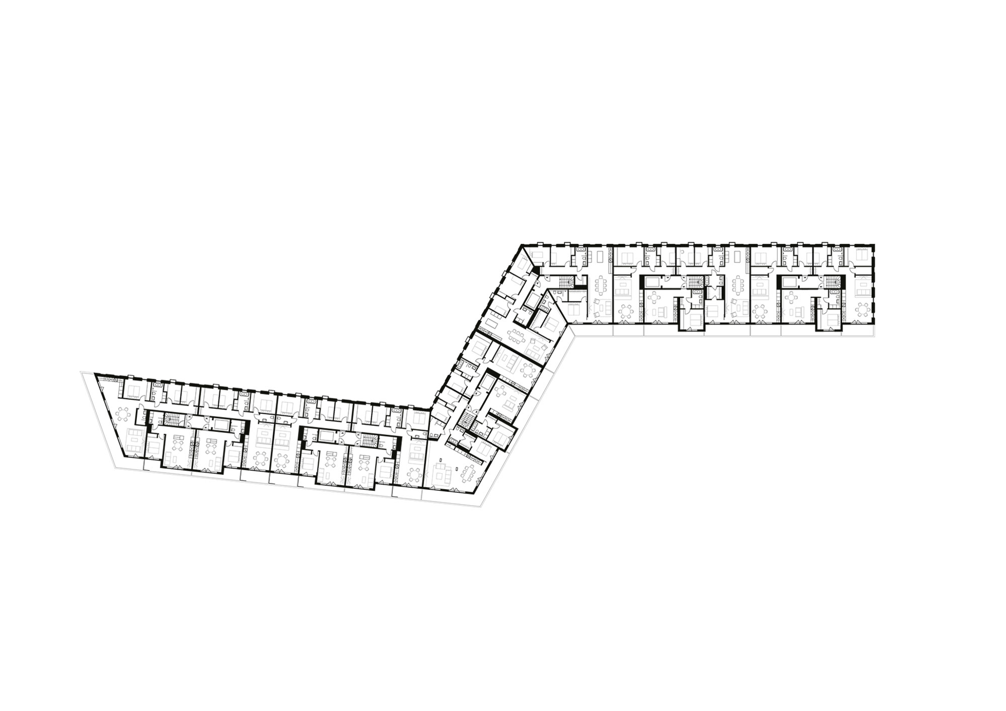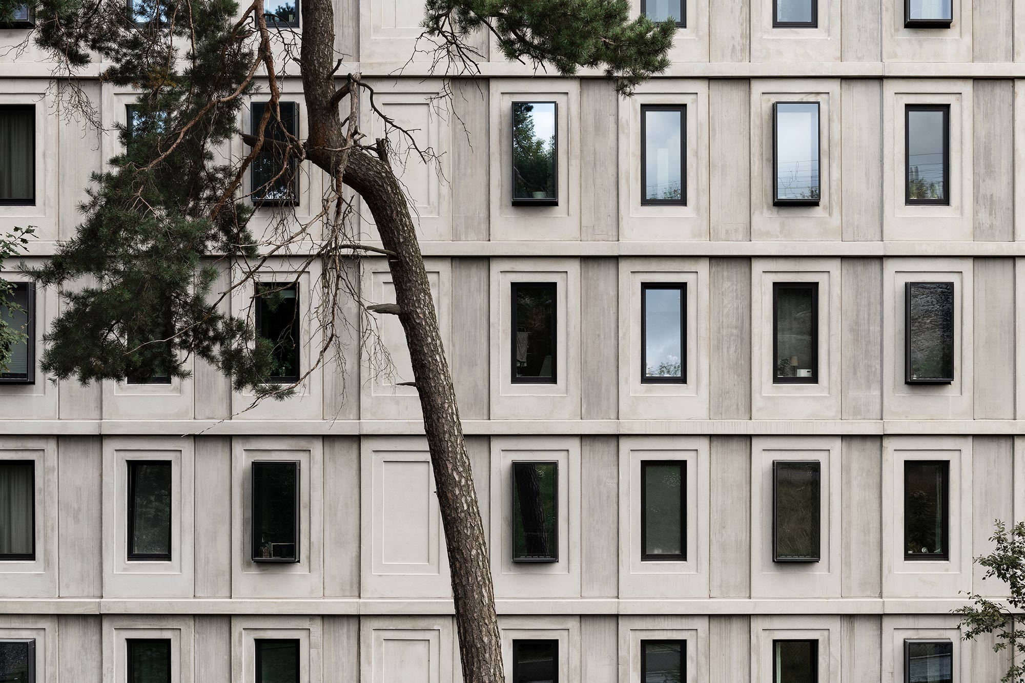 Balneum sits on a dramatic waterfront site and forms the edge to a new residential area at Gröndal Strand on the outskirts of central Stockholm. The long and crooked building contains 134 apartments and is carefully placed on the steeply sloping site to create an exciting silhouette toward the water and to reduce the perception of the building’s volume.