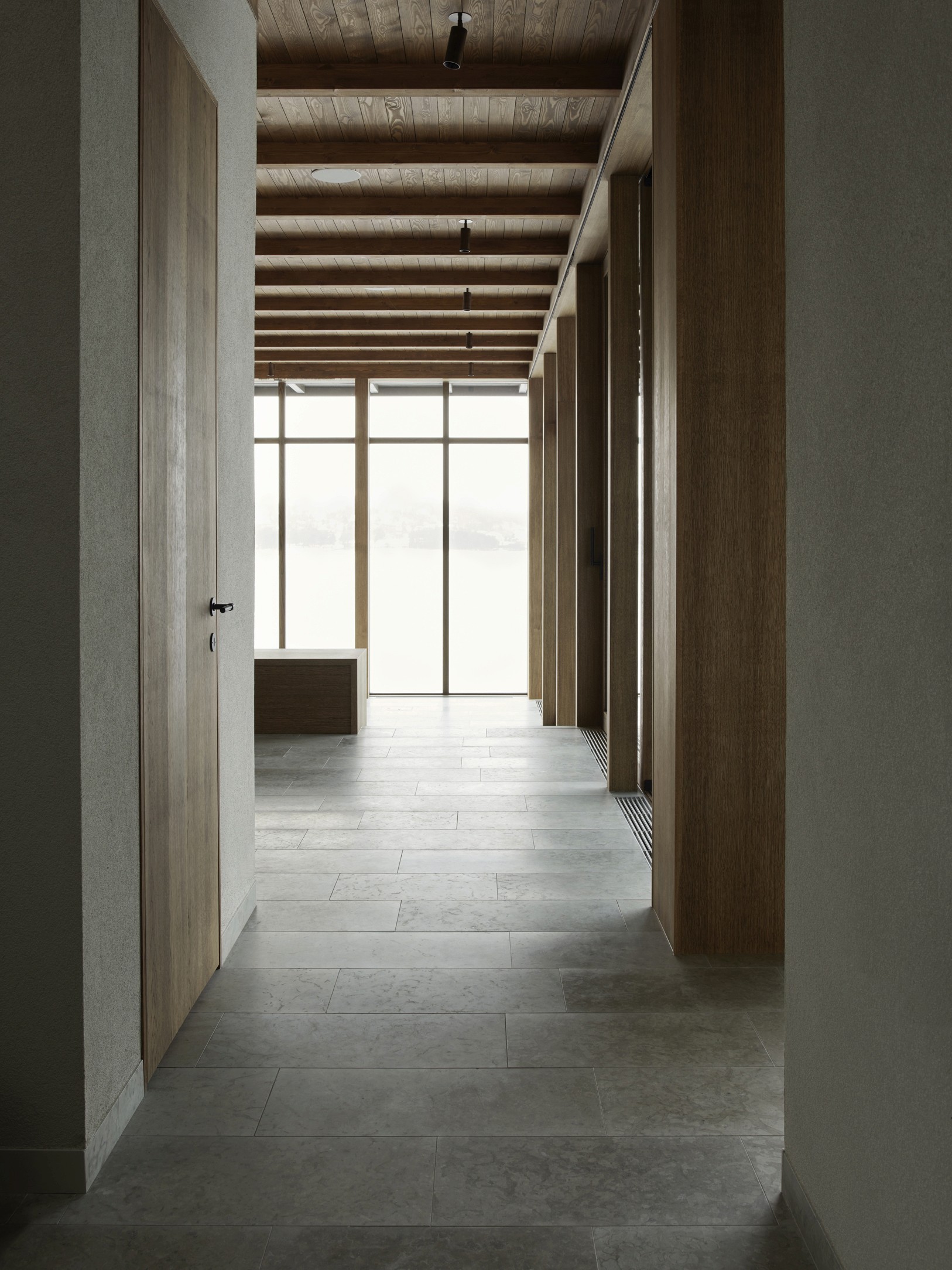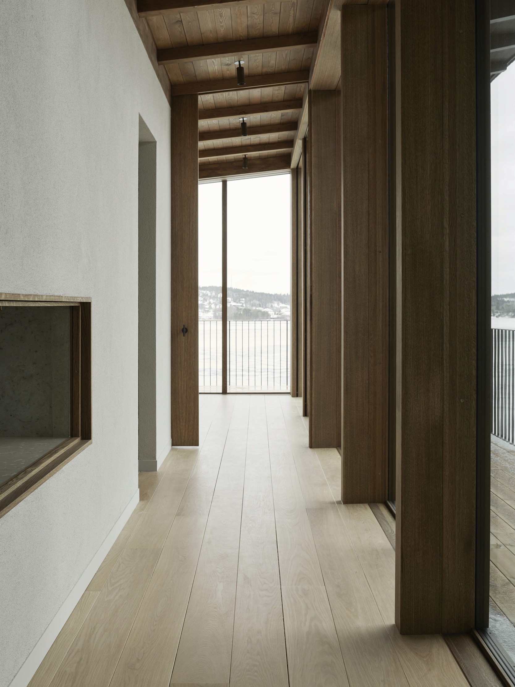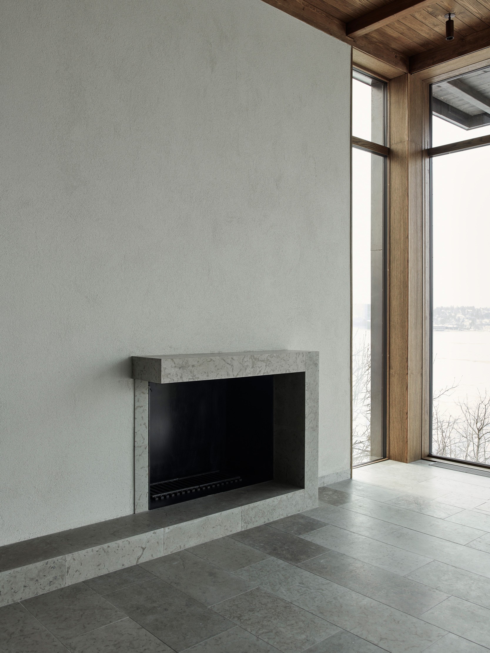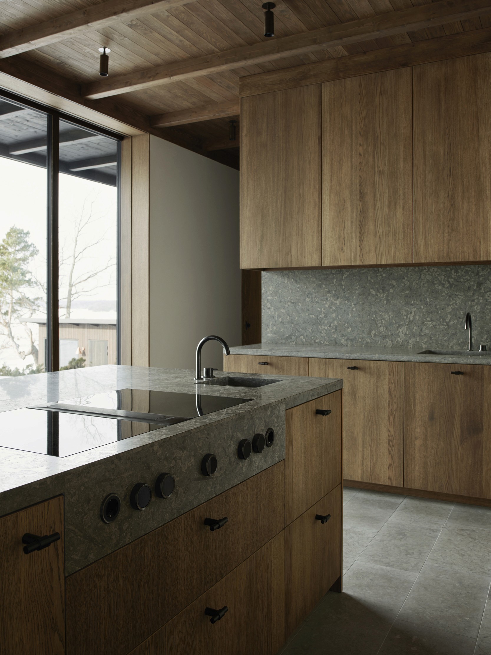 The upper floor contains a substantial master suite and an upper living room with space for a TV, music room and office space. Beyond the connecting family room is a corridor with two smaller bedrooms and one larger one. A balcony follows the length of the lakeside facade and connects to all the bedrooms. The house’s dark material palette is composed of an interior of limestone of different types and finishes, stained wood and plaster, while the exterior is constructed from brick that relates to the colour of the existing rocks, burnt wood paneling and oxidized copper, all of which is deliberately set in a contrasting relationship to the brightness of the site itself. The rocky outcrops, bushes and pine trees become works of art that are framed with the help of the heavily stained window frames. There are obvious references to the small summer house in Aspvik but this time with a darker and more luxurious soundboard that breathes Danish and American 1960s. Only a small wooden gate with a wrought iron frame now remains facing the street as a reminder of what once was. We’ll put tar on it so it lasts forever. Eventually, the wild vine begins to climb the facade and chimney stack again, as it did the first time we came to inspect the site. By then, we consider the project to be completed.