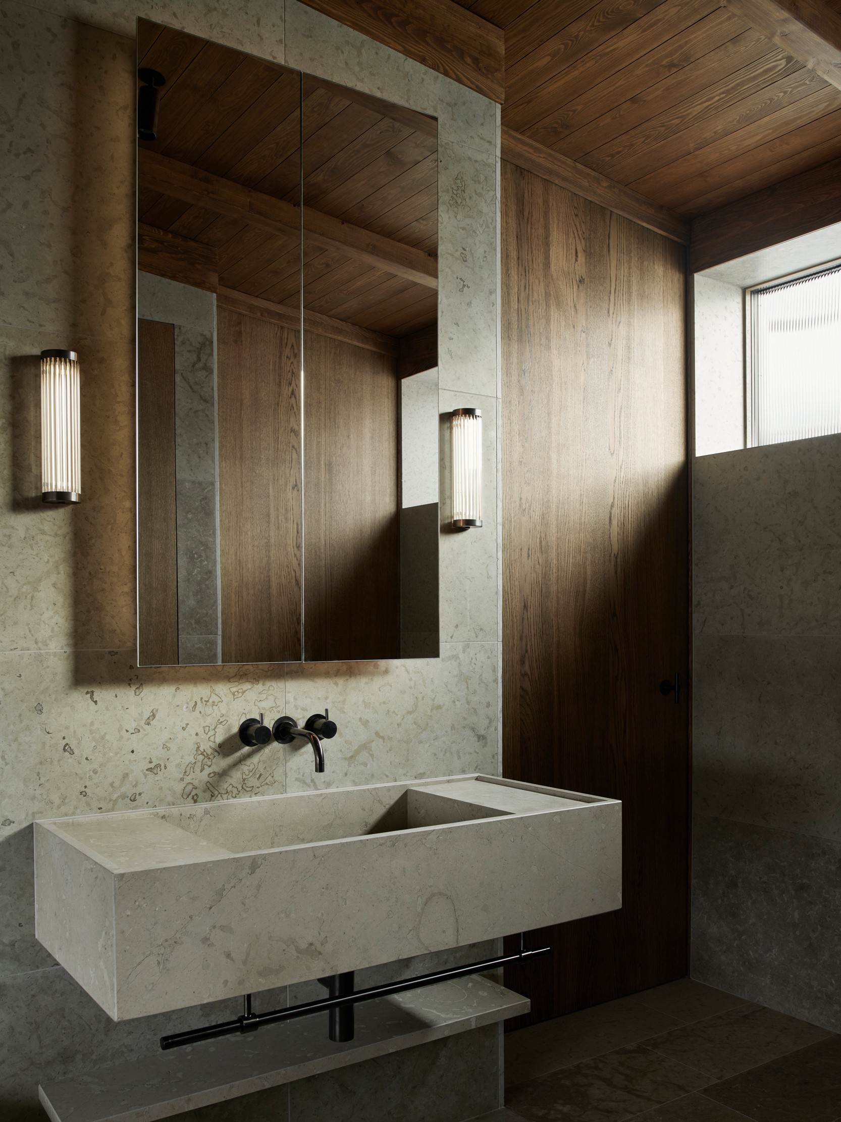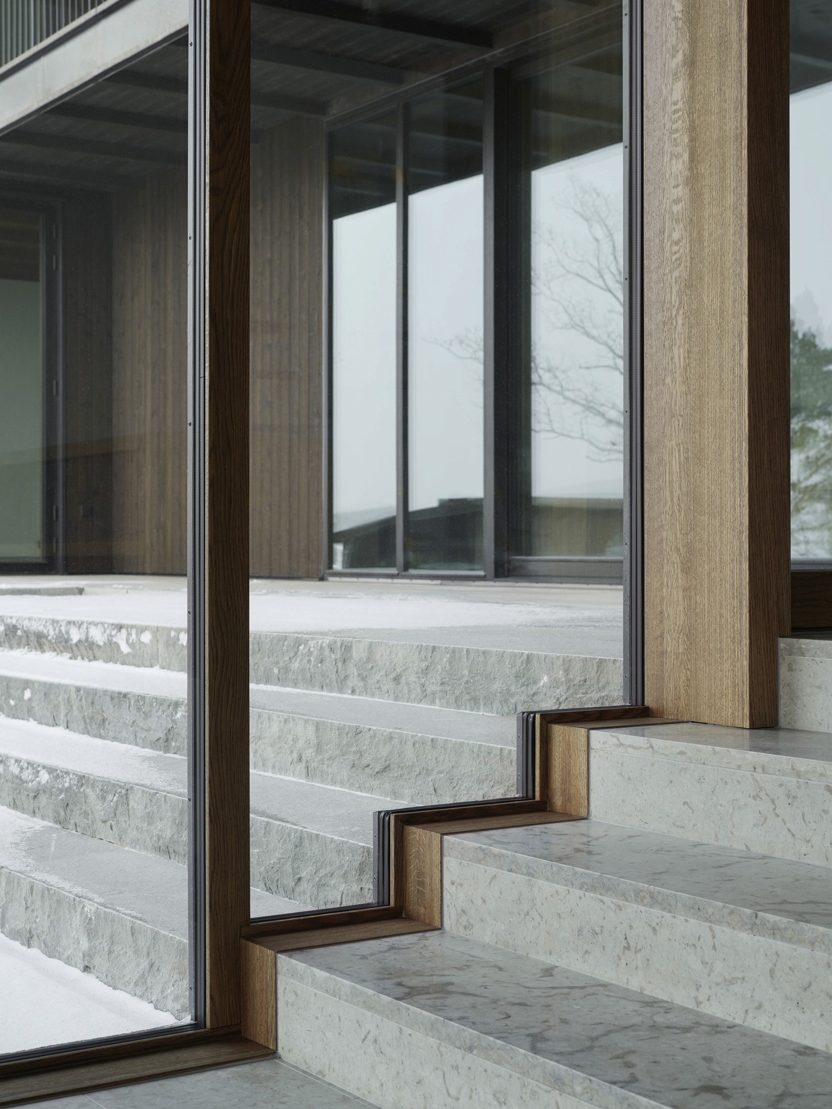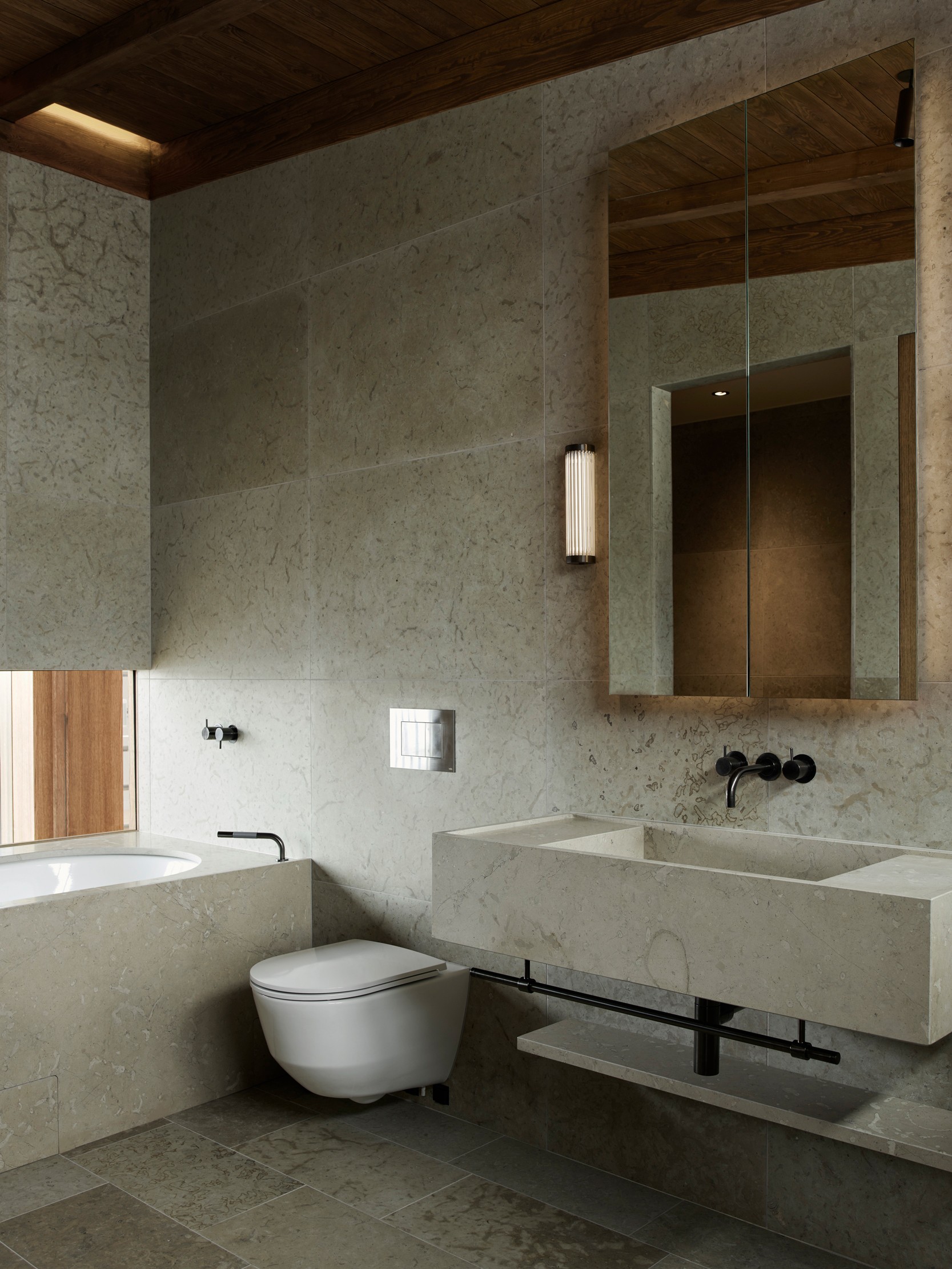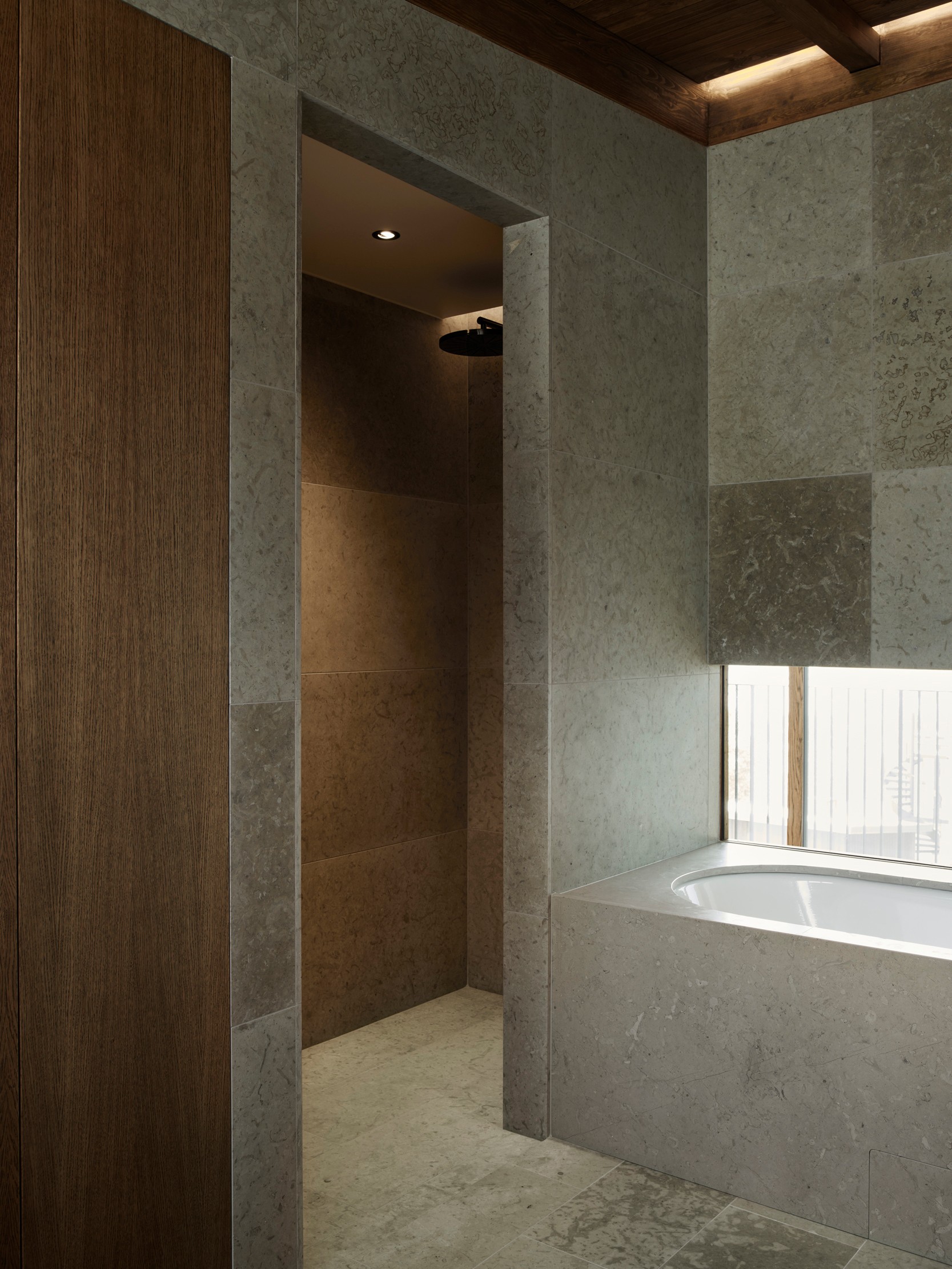 The upper floor contains a substantial master suite and an upper living room with space for a TV, music room and office space. Beyond the connecting family room is a corridor with two smaller bedrooms and one larger one. A balcony follows the length of the lakeside facade and connects to all the bedrooms. The house’s dark material palette is composed of an interior of limestone of different types and finishes, stained wood and plaster, while the exterior is constructed from brick that relates to the colour of the existing rocks, burnt wood paneling and oxidized copper, all of which is deliberately set in a contrasting relationship to the brightness of the site itself. The rocky outcrops, bushes and pine trees become works of art that are framed with the help of the heavily stained window frames. There are obvious references to the small summer house in Aspvik but this time with a darker and more luxurious soundboard that breathes Danish and American 1960s. Only a small wooden gate with a wrought iron frame now remains facing the street as a reminder of what once was. We’ll put tar on it so it lasts forever. Eventually, the wild vine begins to climb the facade and chimney stack again, as it did the first time we came to inspect the site. By then, we consider the project to be completed.
