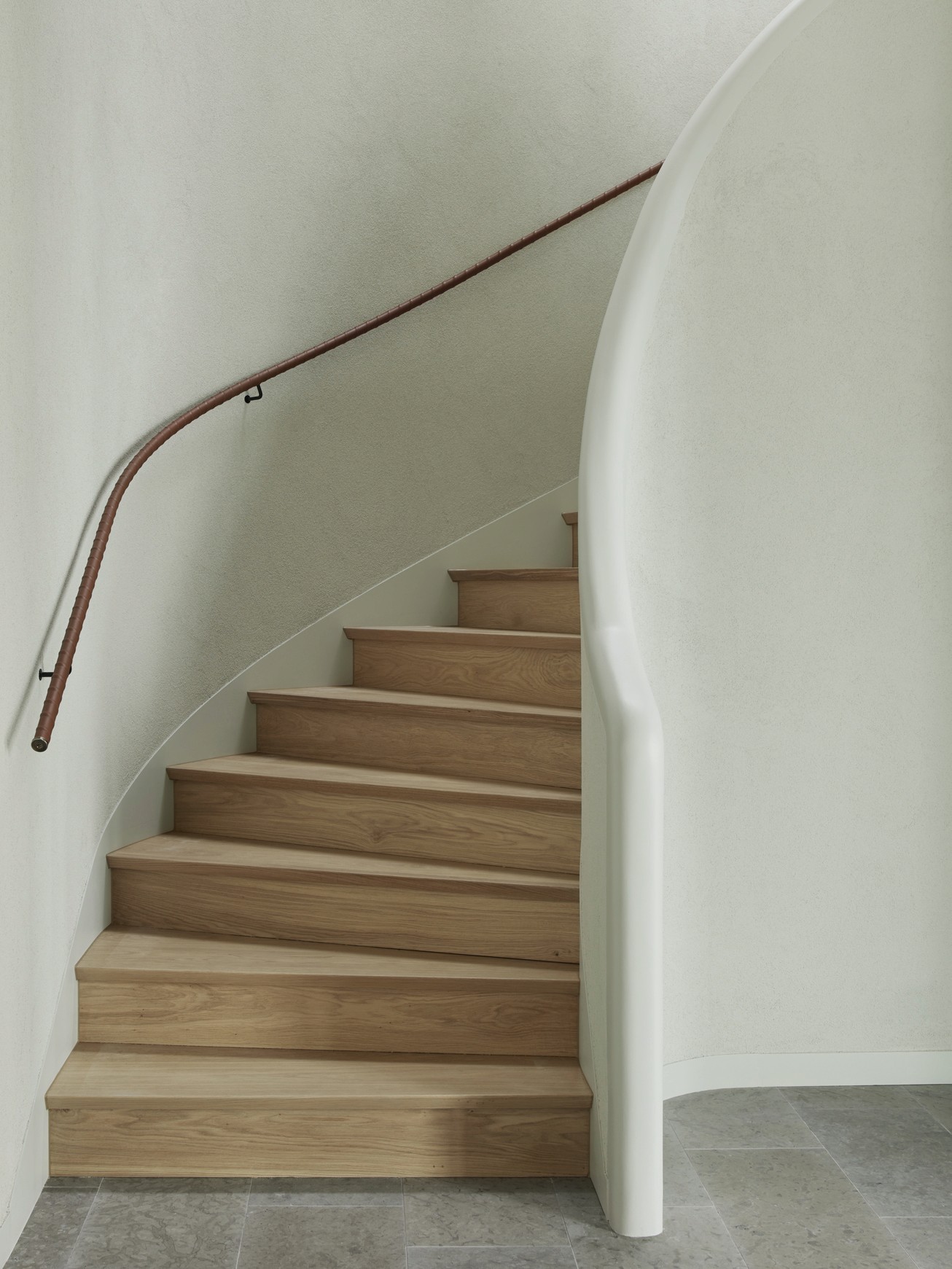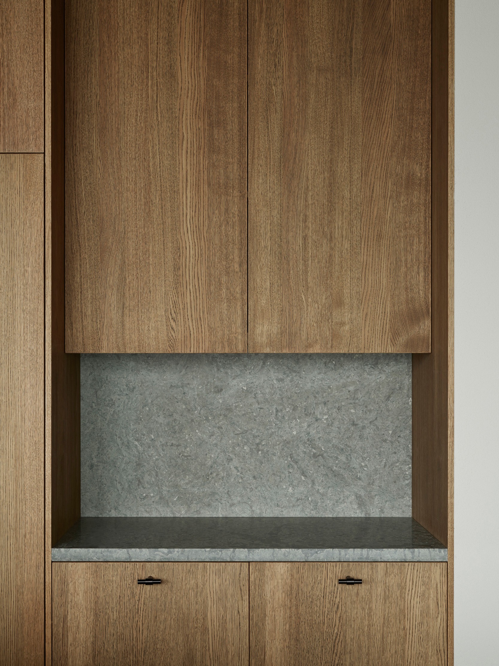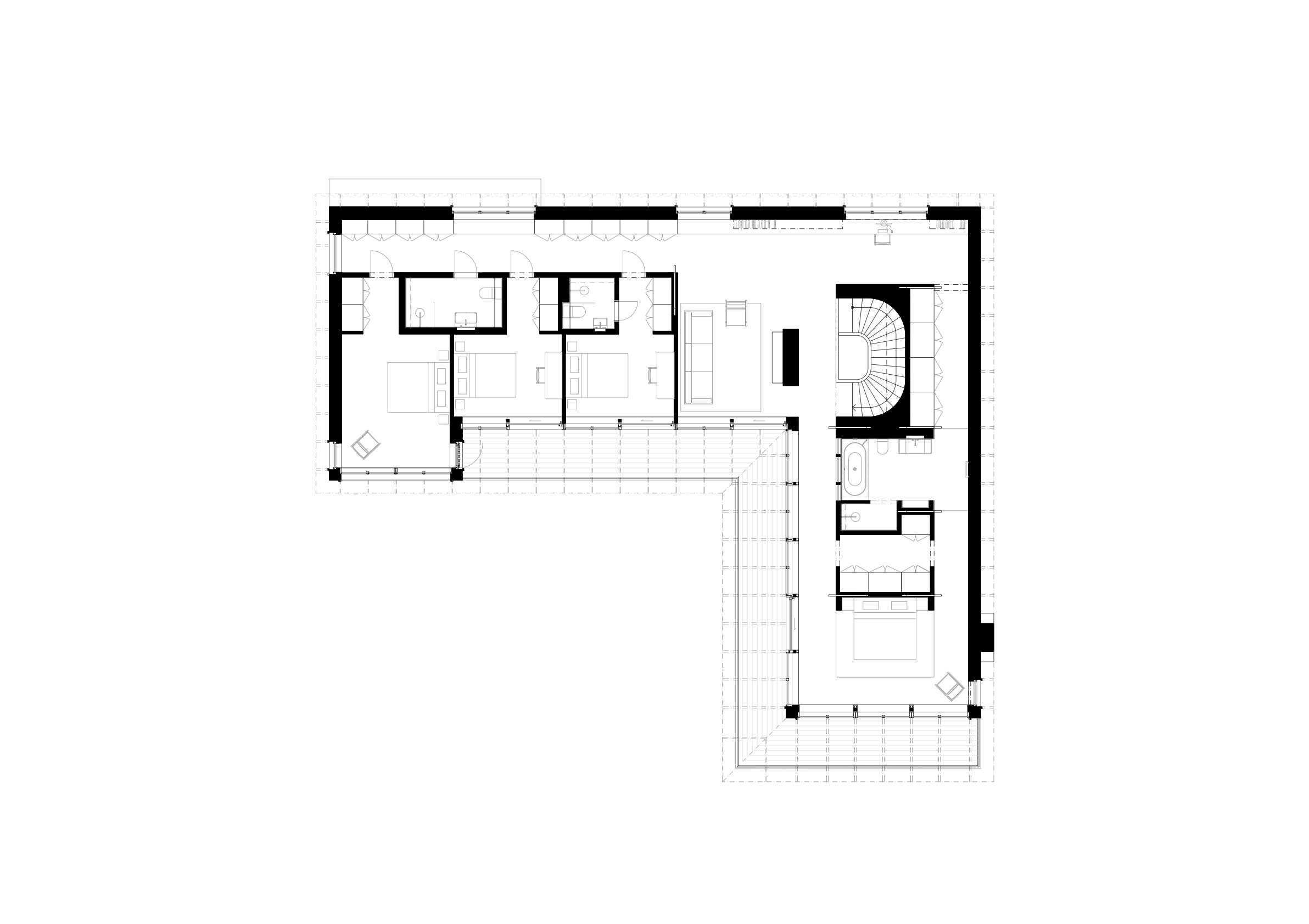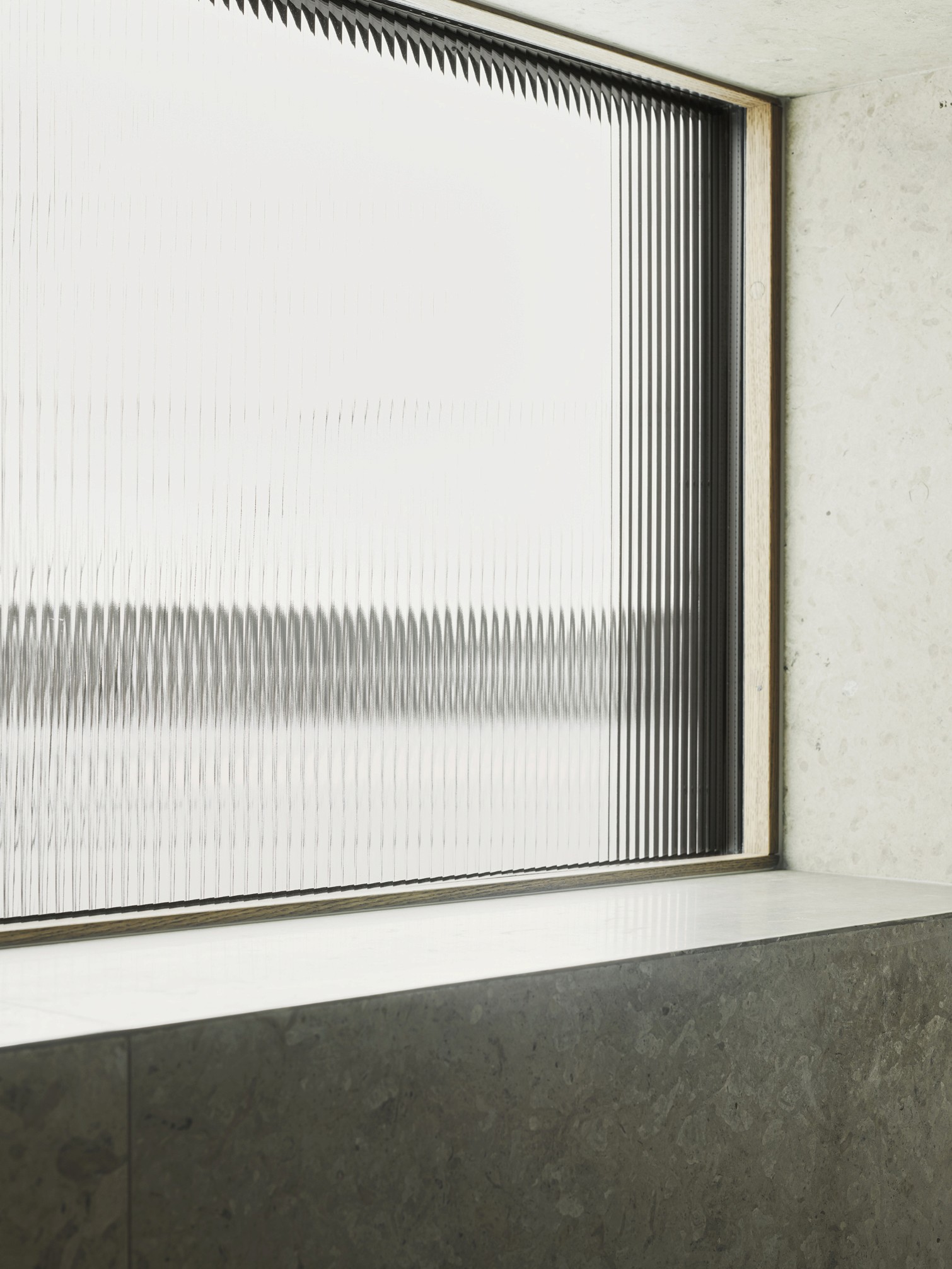 The upper floor contains a substantial master suite and an upper living room with space for a TV, music room and office space. Beyond the connecting family room is a corridor with two smaller bedrooms and one larger one. A balcony follows the length of the lakeside facade and connects to all the bedrooms. The house’s dark material palette is composed of an interior of limestone of different types and finishes, stained wood and plaster, while the exterior is constructed from brick that relates to the colour of the existing rocks, burnt wood paneling and oxidized copper, all of which is deliberately set in a contrasting relationship to the brightness of the site itself. The rocky outcrops, bushes and pine trees become works of art that are framed with the help of the heavily stained window frames. There are obvious references to the small summer house in Aspvik but this time with a darker and more luxurious soundboard that breathes Danish and American 1960s. Only a small wooden gate with a wrought iron frame now remains facing the street as a reminder of what once was. We’ll put tar on it so it lasts forever. Eventually, the wild vine begins to climb the facade and chimney stack again, as it did the first time we came to inspect the site. By then, we consider the project to be completed.