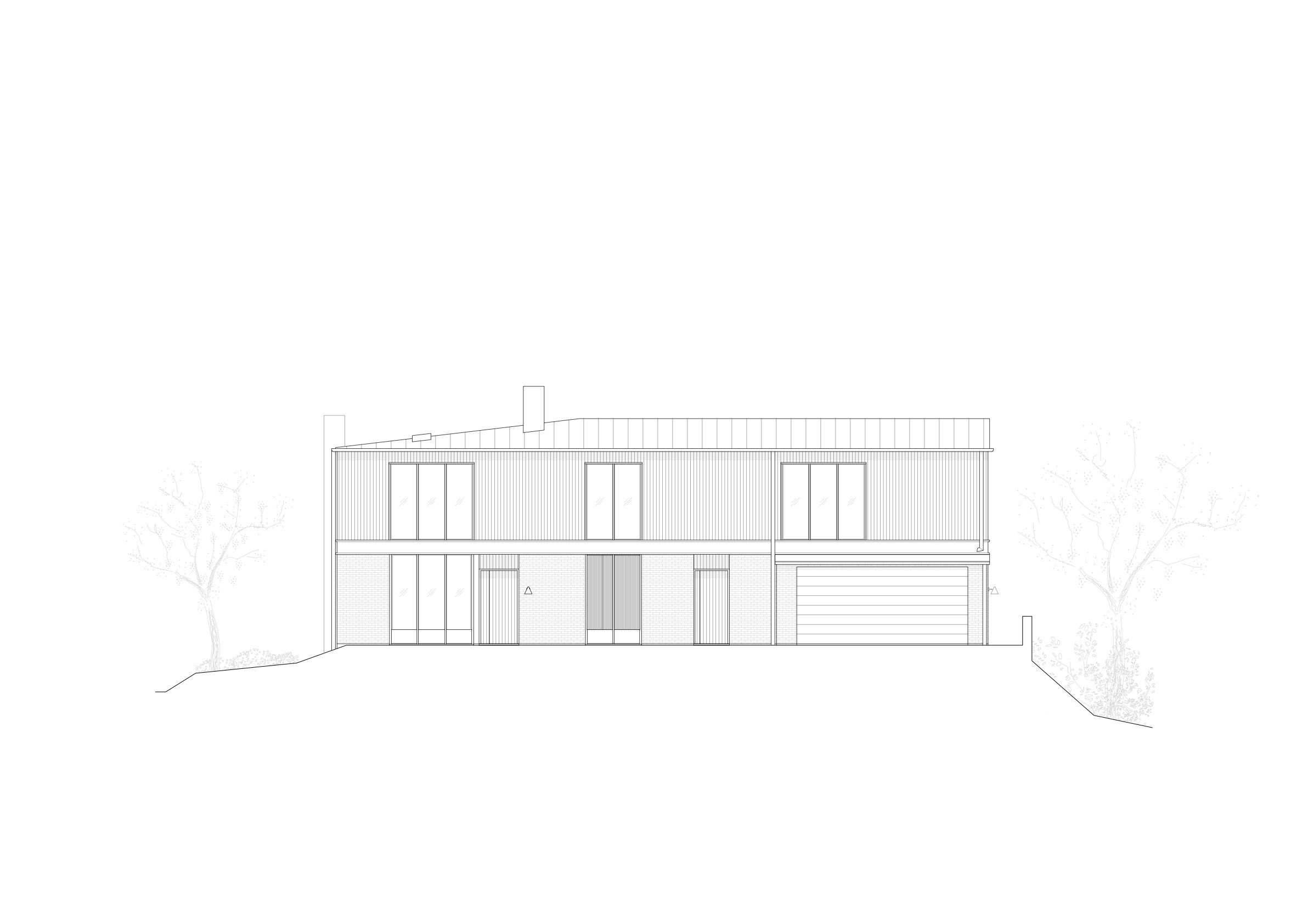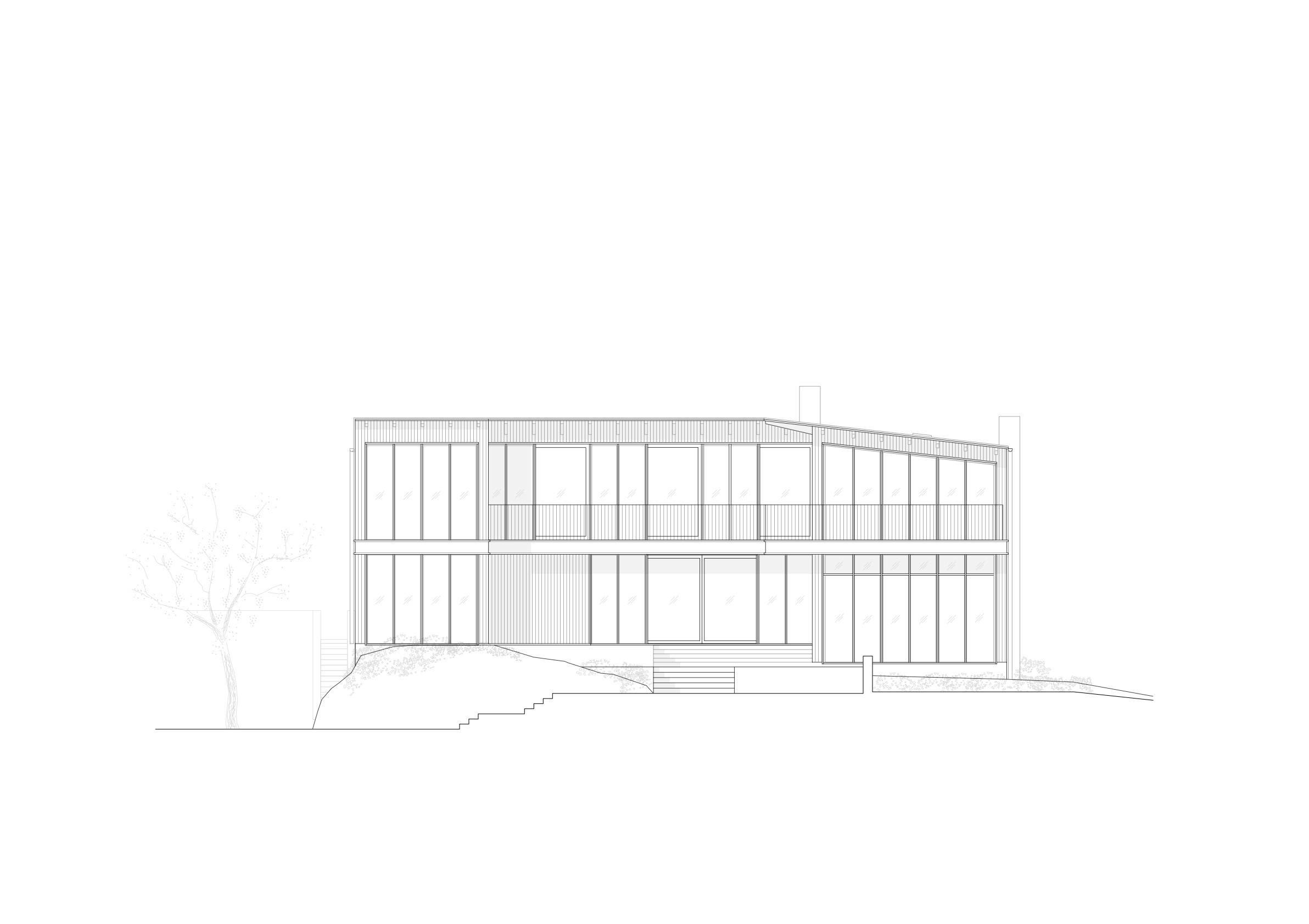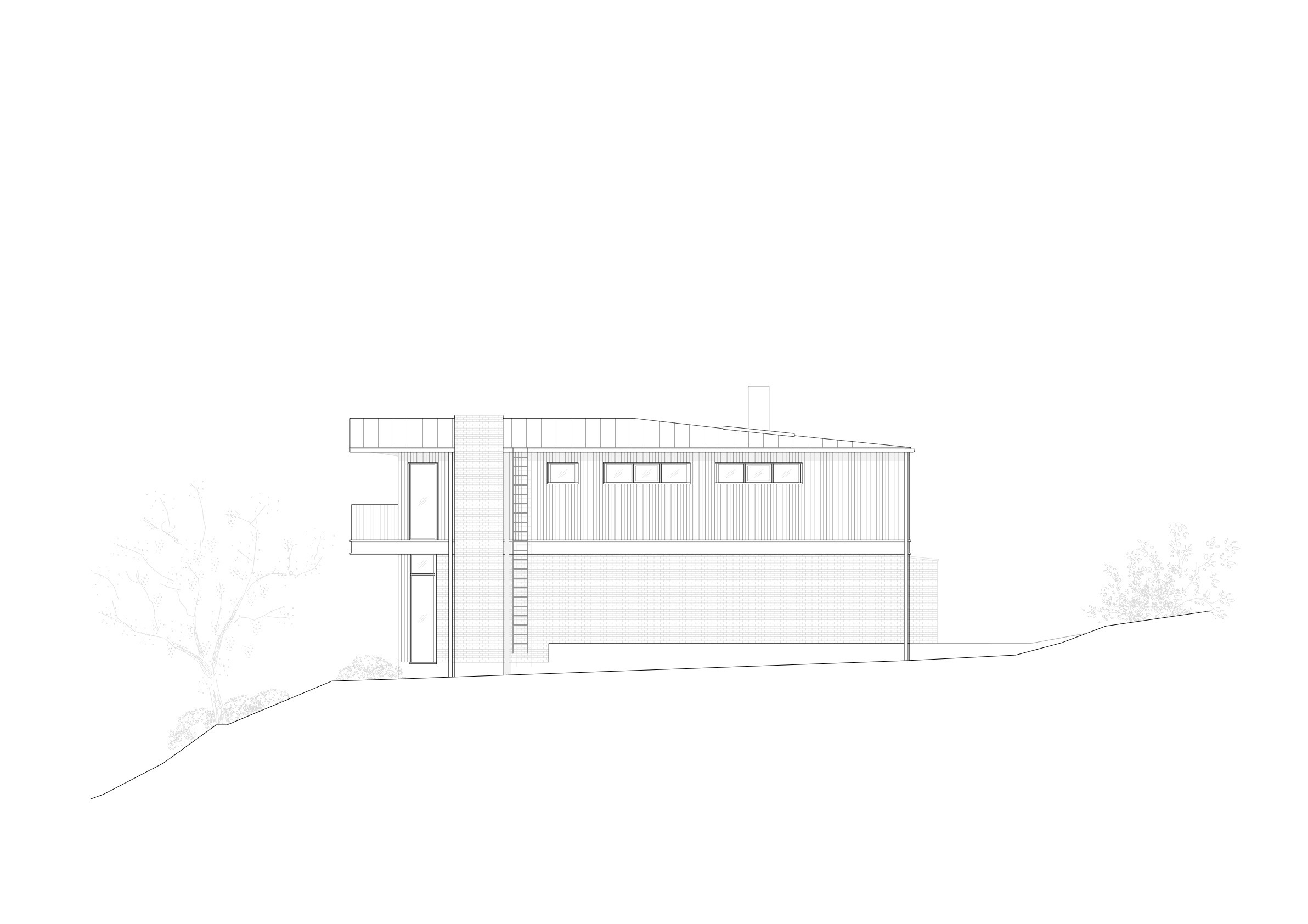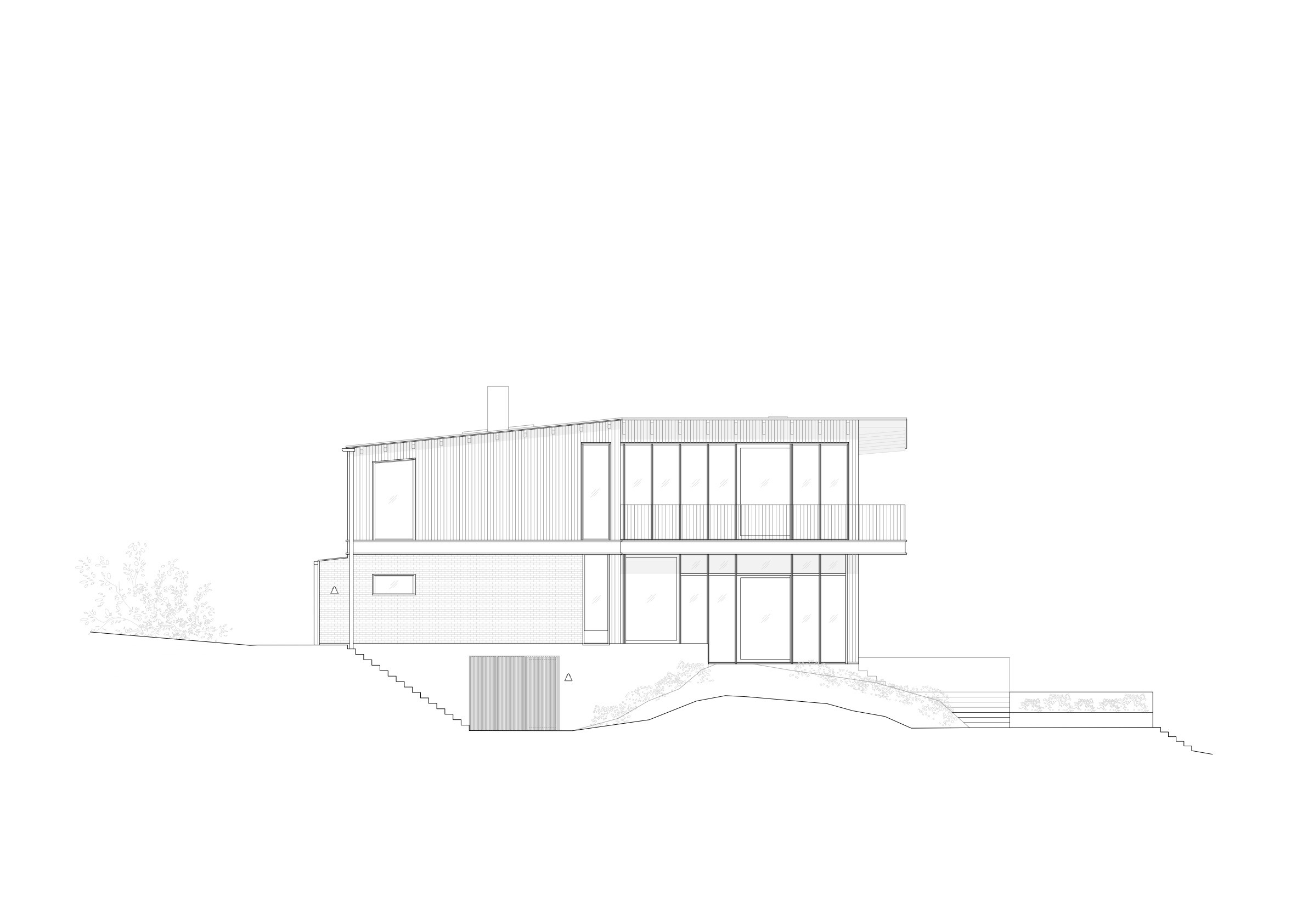 The project's point of departure was in understanding how Erskine interpreted the site’s qualities and with a similar approach, honor what has been by building something new that both in thought and execution breathes care and quality. The new building is not entirely different in plan from its predecessor. Its L-shaped form captures the afternoon sun and the best part of the view, whilst at the same time providing privacy and shelter from the wind. From the street side, the ground floor of the building is brick and relatively closed-off, however, by simply passing over the threshold of the dark entrance door, the overall impression is changed to one of openness, with a wonderful view through the lake side’s full-height, timber-framed glazing, out over the infinity pool, to the the bay beyond. The entrance level contains a hall with a coat rack and a powder room, a corridor leads to the dining area and on to a sunken living room with a brick fireplace. To the right of the entrance there is a kitchen with a double-opening glass partition towards the protected patio, as well as a study with a view. Towards the street there is a garage, main entrance, laundry room and stairs to the basement floor. To the left, behind the entrance is a wine room and a skylit staircase in a plastered stairwell.