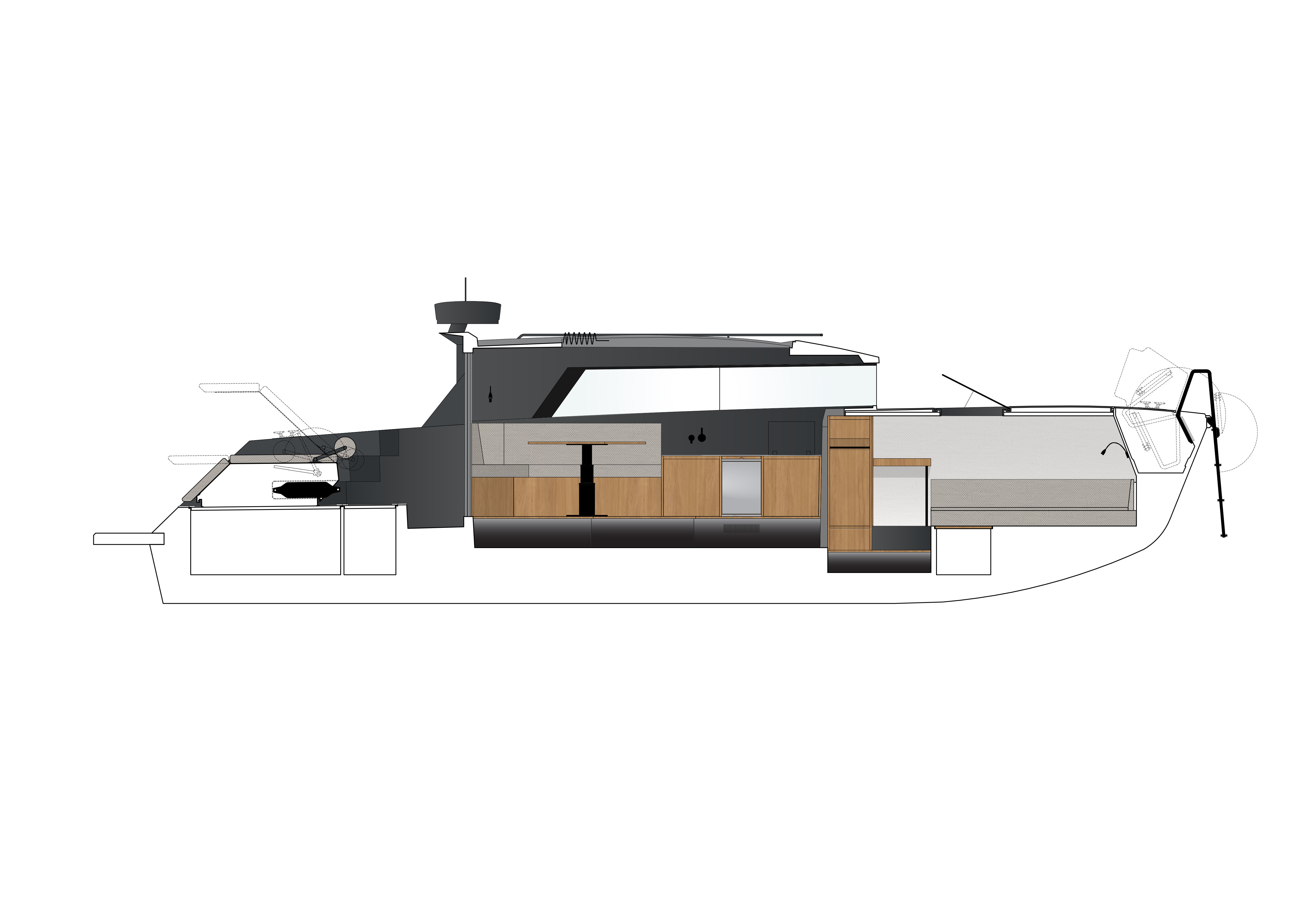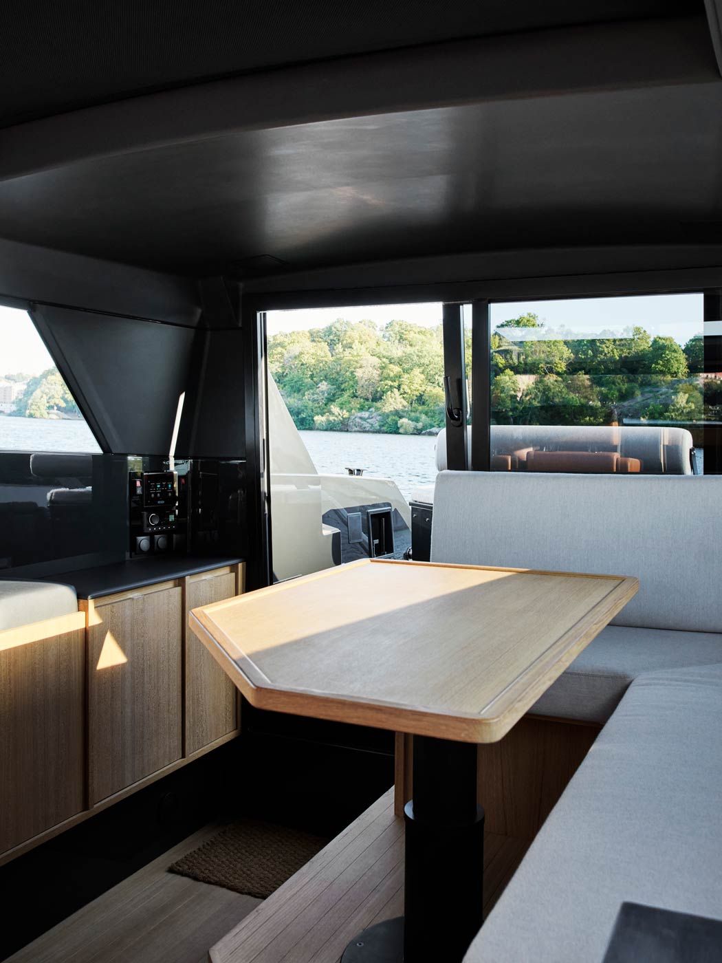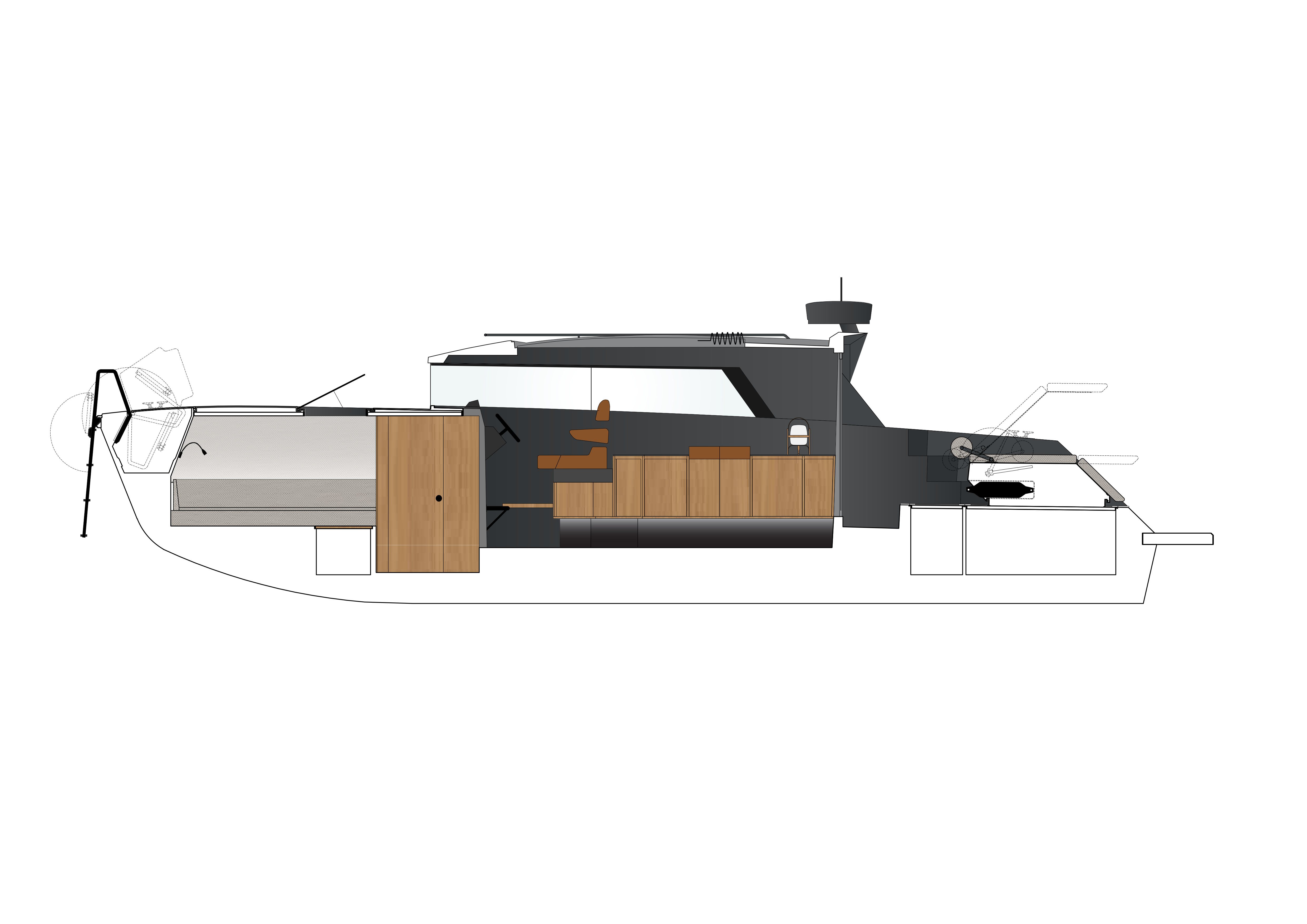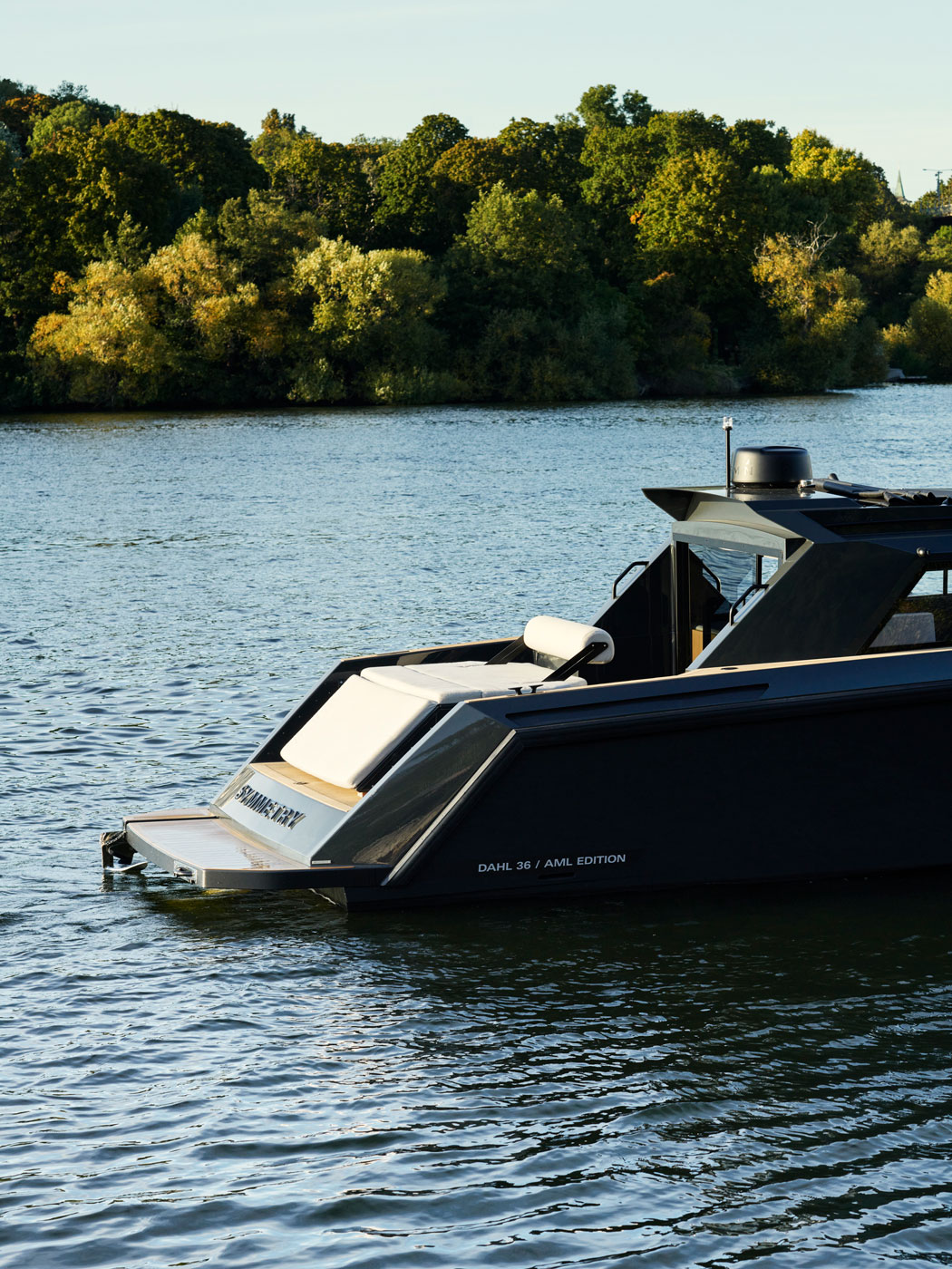 For the first time, with the design of DAHL 36, Andreas Martin-Löf Arkitekter ventured outside the world of architecture and furniture, to tackle the challenges of naval design. The project was initiated due to the office’s relocation to Norr Mälarstrand in Stockholm and its proximity to Riddarfjärdens Marina. A hull of set dimensions, 11 meters long and 3.2 meters wide, designed by Ted Mannerfelt provided the parameters for the boat and the project itself. The brief was for Andreas Martin-Löf Arkitekter to consult on the exterior expression and fully develop the interior concept.